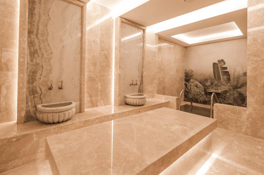 Geleneksel Türk hamamı, buhar odası, sauna gibi ritüel alanlar ile spa deneyimi zenginleştirilmiştir.